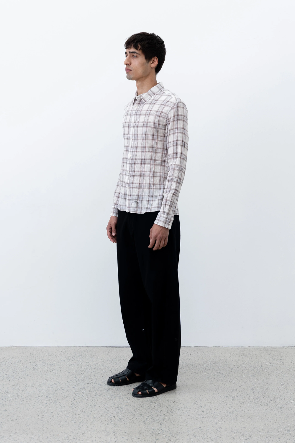 Shirt cut from a tartan crepe plaid with a subtle seersucker texture. Designed with a casual collar and a relaxed silhouette. Finished with an article-stamp logo at the front placket.